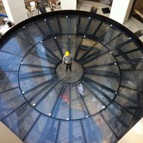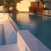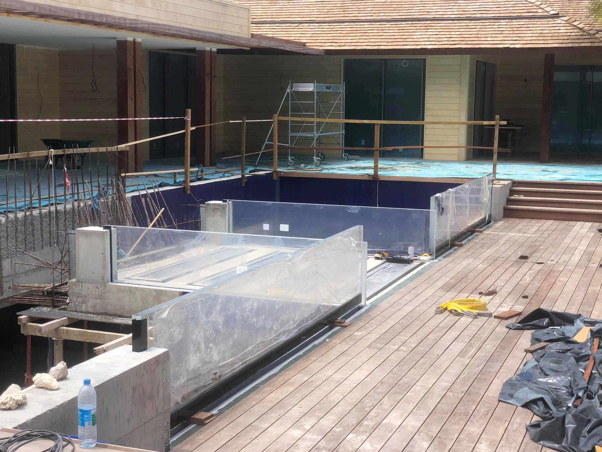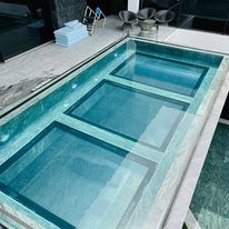 In total, we supplied and fitted ten custom-made transparent windows, the largest of which measures a whopping 7800 x 1700 x 180 mm. From the villa, you look out over a basin where the water rests against clear acrylic - pure elegance and craftsmanship in one image. On top of this basin is a walking window, allowing you to literally walk across the water.